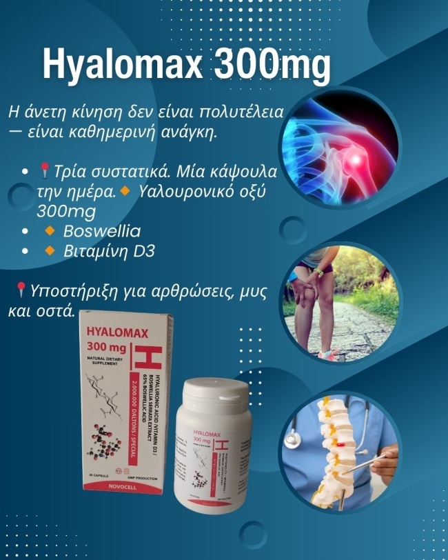 Παράγγειλε το Hyalomax 300mg σήμερα και υποστήριξε φυσικά τις αρθρώσεις και το δέρμα σου.